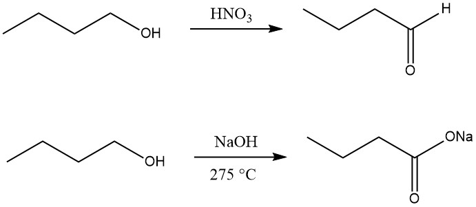 n-부탄올을 카르복실산으로 산화시키는 반응은 275 °C에서 수산화나트륨과 반응시켜 수행할 수 있으며, 이때 수소 및 2-에틸헥산올과 함께 부티르산 나트륨염이 형성됩니다.