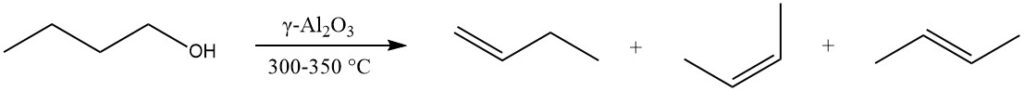 1-부탄올은 고온(300-350 °C)에서 γ-Al2O3와 같은 촉매를 사용하여 부텐 혼합물(1-부텐, 시스-2-부텐, 트랜스-2-부텐)로 탈수될 수 있습니다. 더 낮은 온도에서 탈수 촉매가 존재할 경우 디부틸 에테르가 생성됩니다.