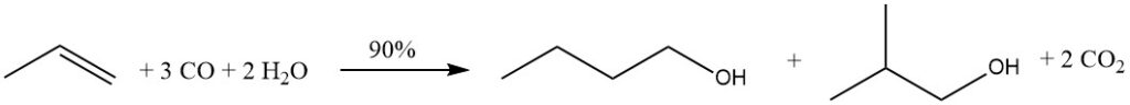 1-부탄올 생산의 또 다른 방법은 1942년 레페(REPPE)가 발명한 기술인 프로펜의 카르보닐화입니다. 이 공정에서는 다핵 철 카르보닐 하이드라이드의 3차 암모늄염과 같은 촉매 존재 하에 압력을 가해 올레핀, 일산화탄소, 물을 반응시킵니다.