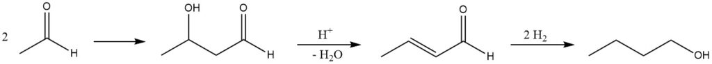• 크로톤알데하이드의 수소화: 아세트알데하이드의 알돌화 반응을 통해 형성됩니다.