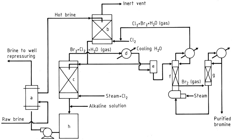 a) 브롬 교차 열교환기; b) 염소 흡수기; c) 증기 추출탑; d) 응축기; e) 분리기; f) 스트리핑 컬럼; g) 분별 증류탑; h) 중화기