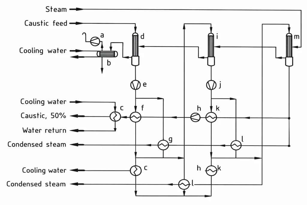 a) 진공 펌프; b) 응축기; c) 가성 용액 냉각기; d) 제1 증발기; e) 가성 용액 펌프; f) 제1 가성 용액 열교환기; g) 제2 열교환기; h) 가성 용액 펌프; i) 제2 증발기; j) 가성 용액 펌프; k) 제2 가성 용액 열교환기; l) 제1 열교환기; m) 제3 증발기