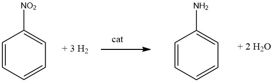 니트로벤젠의 강력한 발열 촉매 수소화(200 °C에서 ΔH = -544 kJ/mol)는 상업적으로 사용되는 공정에서 기상과 액상 모두에서 수행됩니다.