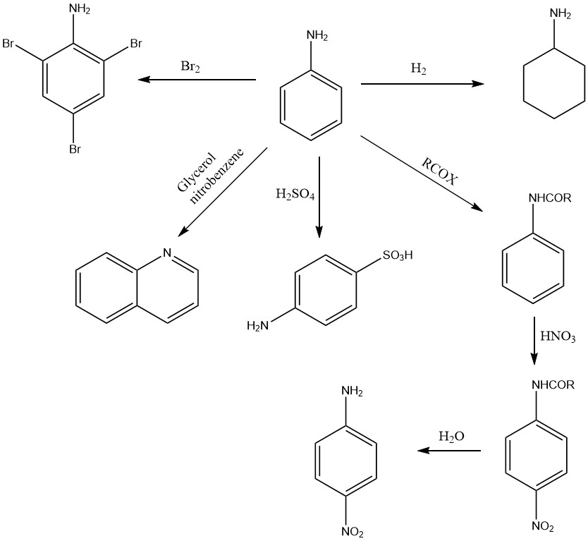 아닐린으로부터 수많은 N-헤테로사이클릭 화합물을 얻을 수 있습니다. 예를 들어 퀴놀린은 니트로벤젠 내에서 아닐린과 글리세롤 또는 아크릴알데히드(아크롤레인)의 축합을 통한 스크라우프(Skraup) 합성에 의해 생산됩니다.
