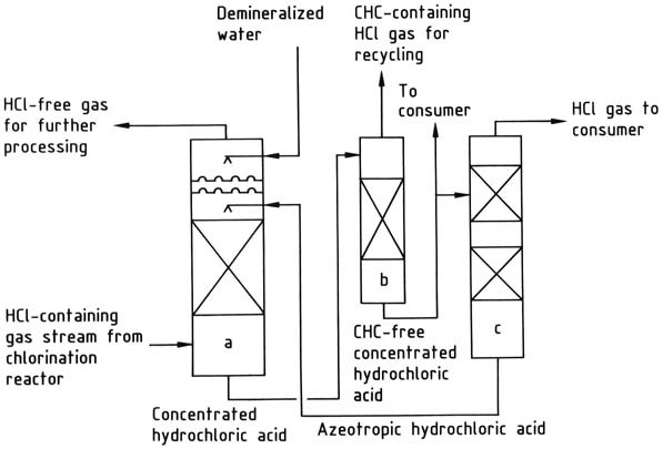 염화수소는 물이나 20 wt % 염산 용액을 사용하여 흡수할 수 있습니다. 최종 제품으로 30-35 wt % 염산을 생산하는 것이 목적일 때는 물이 적합합니다. 산에 대한 수요가 충분하지 않으면 20% 공융 혼합물(azeotrope)을 흡수에 사용하여 산의 농도를 30-35 wt %로 농축합니다.